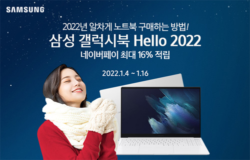 유니씨앤씨는 2022년 새해를 맞아, AMOLED 디스플레이와 초슬림 초경량 디자인으로 뛰어난 휴대성을 자랑하는 삼성 갤럭시북 프로 / 프로360 / 프로360 5G을 대상으로 네이버페이 최대 16% 적립과 푸짐한 혜택이 증정되는 ‘삼성 갤럭시북 Hello 2022’ 프로모션을 2022년 1월 4일부터 1월 16일까지 네이버 스마트스토어를 통하여 단독 진행한다.