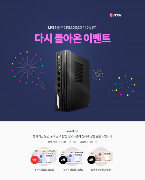 2022년 1월 1일부터 2022년 1월 31일까지 한정 수량으로 진행되는 이번 행사에서 MSI는, ‘MSI 미니 DP21’의 구매자를 대상으로, 구매한 금액을 합산하여 상위 3인에게 신세계 상품권을 차등 지급한다. 또한 제품의 후기를 작성한 모든 구매자를 대상으로 컴퓨존 적립금을 전원 지급한다.