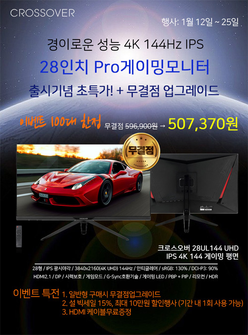 크로스오버는 28형 4K 고해상도 144Hz 게이밍 모니터 ‘28UL144 UHD IPS 4K 144 게이밍 평면’ 출시기념 무결점 무료 업그레이드 및 특가 이벤트를 진행한다고 밝혔다.