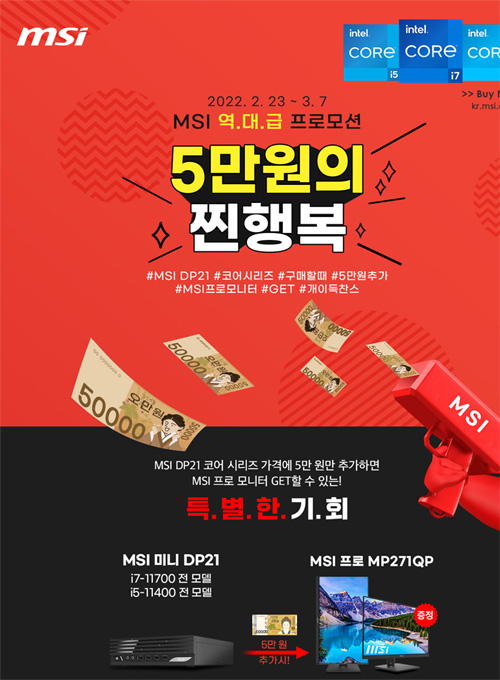 이번 MSI ‘5만원의 찐행복’ 프로모션은 2022년 2월 23일부터 3월 7일까지 진행되며, 해당기간 동안 컴퓨존 프로모션 페이지를 통해 MSI 미니 DP21 코어 시리즈 판매가에 5만원이 추가된 최종 판매가로 구매할 시 프로 모니터를 증정한다. MSI 미니 DP21 i7, i5 전 모델 판매가에서 5만원 추가 결제 시 MSI 프로 MP271QP 제품을 증정하고 있으며, MSI 미니 DP21 i3-10105 모델에 5만원 추가 결제 시 MSI 프로 MP271 제품을 받을 수 있다.