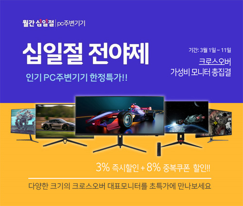 이번 행사 동안 크로스오버의 27, 28, 32,34, 38, 40형, 고해상도, 고Hz, 평면, 게이밍 등 다양한 모니터들이 저렴하게 판매된다. 이번 특가 상품들은 컨텐츠 내에 ‘십일절 PC주변기기’ 배너가 위치하는데, 내용을 보면 즉시할인 3%, 모니터 중복할인 8% 혜택을 적용할 수있다. 행사기간은 3월 1일 화요일부터 11일 금요일까지 펼쳐지며, 행사 기간동안 판매되는 제품들은 전부 무료 배송으로 발송된다.