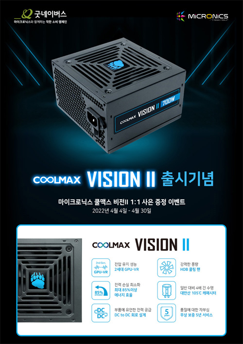마이크로닉스는 쿨맥스 비전 II 시리즈 파워서플라이 출시를 기념해 오는 4월 30일까지 구매자를 대상으로 사은품과 쿠폰 등을 증정하는 이벤트를 진행한다.