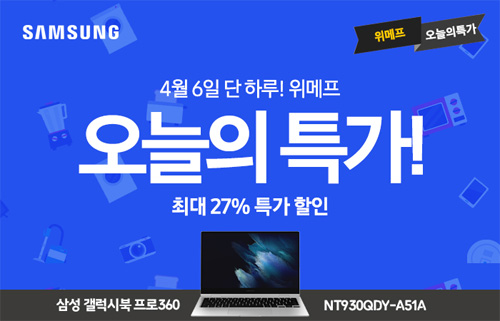유니씨앤씨는 4월을 맞아 Super AMOLED 디스플레이와 최신 인텔 11세대 타이거레이크, 그립감이 뛰어난 S펜이 탑재된 삼성 갤럭시북 프로360 NT930QDY-A51A 대상으로 최대 44만원 중복 할인과 푸짐한 혜택이 주어지는 ‘오늘의 특가’ 프로모션을 2022년 4월 6일 단 하루 동안 위메프를 통하여 단독 진행한다.