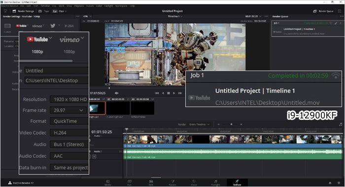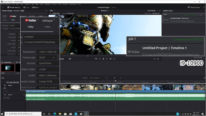 다빈치리졸브를 이용해 4K 영상 편집 테스트를 진행한 모습으로 (640MB, 920MB, 990MB 4K 동영상을 단일 동영상으로 랜더링, FHD 해상도에 H.264 비디오 코덱) 10세대 최상급 모델인 i9-10900 시간차가 확연한 것을 확인할 수 있다. (2배 이상의 차이가 발생했다.)
