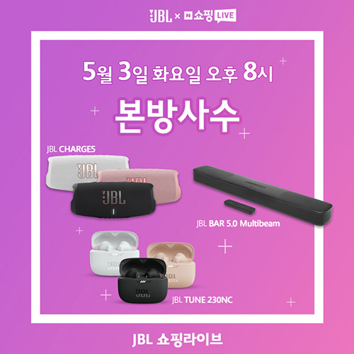 라이브 방송에서는 JBL 신제품인 TUNE 230NC 노이즈 캔슬링 무선 이어폰과 야외에서도 강력한 JBL CHARGE5 블루투스 스피커, 가상 돌비 애트모스 사운드를 출력하는 JBL BAR 5.0 Multibeam 사운드바를 선보인다. 라이브 방송 중 구매 시, 정가 대비 최대 41% 할인 혜택이 제공된다.