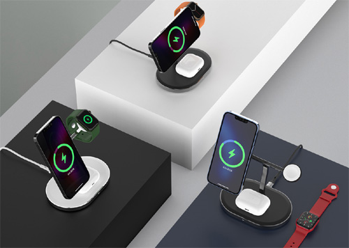 3in1 애플 MFM인증맥세이프 고속무선충전기는 애플 공식인증(MFM)을 받은 무선 충전기로 아이폰, 에어팟, 애플워치동시 충전이 가능하다. 아이폰12 모델부터 적용된 공식 맥세이프(MagSafe) 모듈을 탑재해 편의성을 높인 것이 특징이다. 자석식무선충전 모듈 맥세이프 방식을 통해 아이폰을 간단하게 탈부착 및 무선 충전할 수 있다. 한국전통의 '솟대' 이미지를 형상화한 조형적인 디자인으로 사용자의 환경에 따라 무선충전기의 상하 각도를 위아래 최대 20°까지 조절이 가능하다. 아연 합금에 크롬 도근된 고급스러운 금속 마감재 사용으로인테리어 아이템으로도 손색이 없다.