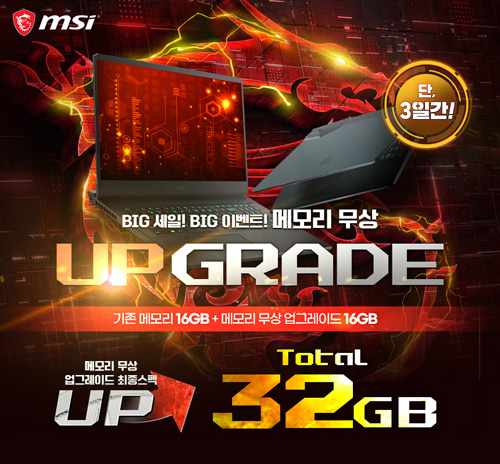 이번 메모리 업그레이드 행사는 G마켓에서 'GP76 레오파드 11UG'를 구매하는 고객에게 기본 16GB 메모리에서 16GB가 추가된 총 32GB 메모리를 제공한다. 여기에 15% 빅스마일데이 선택쿠폰 및 10% 중복쿠폰, 7% 카드할인 혜택을 제공해 최종가 약 145만원에 구매 가능하다.