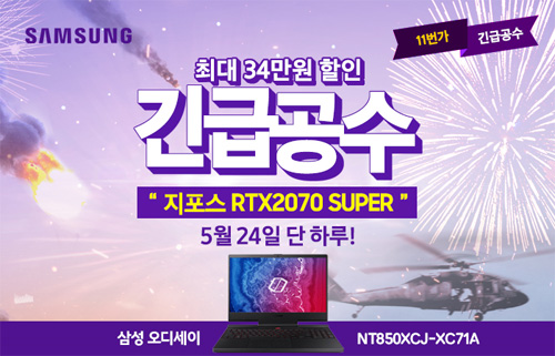 유니씨앤씨는 인텔 10세대 i7 헥사코어와 지포스 RTX 2070 Super 외장그래픽이 탑재되어 극강 게이밍 퍼포먼스를 선사하는 삼성 오디세이 NT850XCJ-XC71A 모델을 대상으로 최대 34만원 할인 및 푸짐한 혜택이 증정되는 ‘긴급공수’ 프로모션을 2022년 5월 24일 단 하루 11번가를 통하여 단독 진행한다.