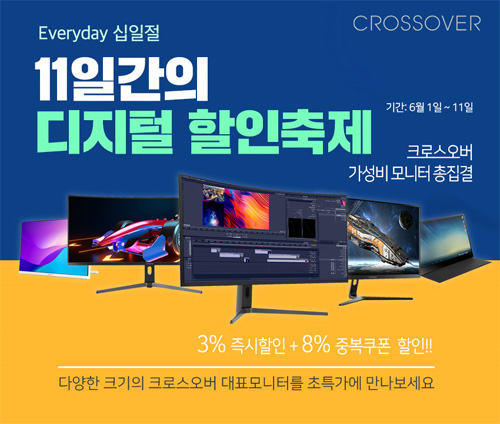 크로스오버는 자사의 인기 게이밍 및 고해상도 모니터 76종을 대상으로 11번가 6월 에브리데이 십일절 이벤트를 진행한다.