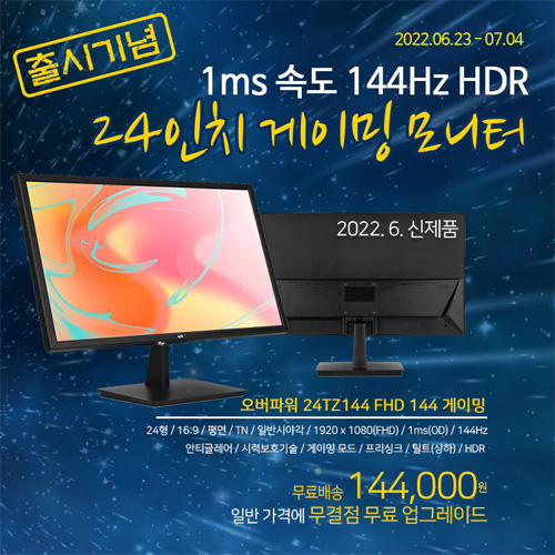 네이버 스토어팜을 대상으로 6월 23일(목) ~ 7월 4일(월)까지 진행되는 이번 출시기념 행사에서 오버파워 24TZ144 FHD 144 게이밍 모니터를 일반모델 가격인 144,000원을 결재하면 무료로 무결점 업그레이드를 진행해 출고한다. 행사는 선착순 100대 한정으로 진행되며, 고객의 부담을 덜기 위해 배송비는 무료다.