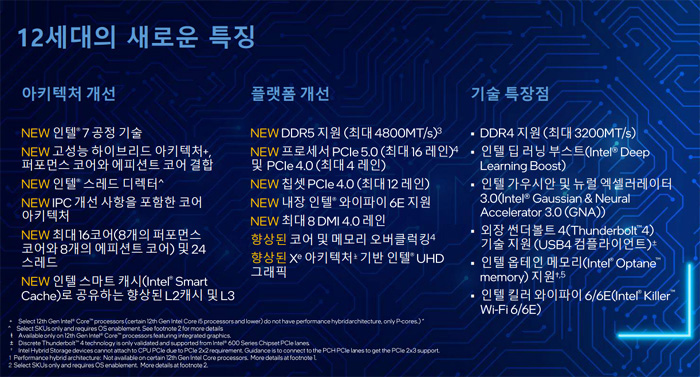 9세대 대비 12세대 인텔코어 에서는 다양한 기능이 추가되거나 새로운 기술이 적용되었다. 인텔 7공정에 하이브리드 아키텍쳐가 적용되어 있고 인텔 스레드 디렉터와 IPC 개선, 향상된 L2와 L3 캐시로 성능 향상을 꾀했다. (참고로 인텔 스레드 디렉터는 운영 체제가 적합한 스레드를 시간에 맞춰 적절한 코어에 배치하도록 안내해 두 개의 새로운 마이크로아키텍처가 원활하게 함께 작동할 수 있도록 한다.)