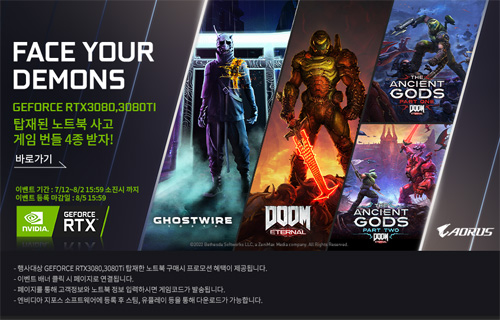 에스라이즈는 엔비디아 지포스 RTX 3080, 3080Ti 그래픽 카드를 탑재한 기가바이트 게이밍 노트북 구매자 대상으로 ‘DEATHLOOP, Ghostwire: Tokyo’(데스루프 고스트 와이어 도쿄), DOOM Eternal(둠 이터널), ‘The Ancient Gods Part one (더 에이션트 갓 파트원)’,The Ancient Gods Part two (더 에이션트 갓 파트투)’ 총 4종의 게임 번들을 증정하는 프로모션을 진행한다고 밝혔다.