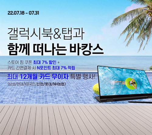 엔씨디지텍에서 7월18일부터 7월31일까지 삼성노트북 갤럭시북 시리즈 모델들을 대상으로 행사 특별 할인과 다양한 혜택이 가득한 ‘갤럭시북과 함께 떠나는 바캉스’ 특별 기획행사를 진행한다고 한다.