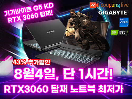 블루죤은 오는 8월 4일 오후 7시부터 쿠팡 라이브를 통해 기가바이트 G5 KD 게이밍 노트북을 RTX 3060 탑재 노트북 중 최저가로 한정 판매할 예정이라고 전했다.