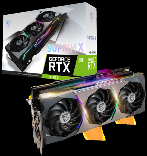 대부분의 그래픽카드가 그러하듯 동일 GPU를 사용했음에도 급이 나뉘어 있어 보급형과 최고급형간 분명한 성능차를 보여준다. 이번시간에서는 하이엔드 PC를 만드는 만큼 최상의 성능을 구현하는 최고급형 그래픽카드를 선택했다. ‘MSI 지포스 RTX 3090 Ti 슈프림X 24GB 트라이프로져2S’ 그래픽카드는 냉각을 극대화한 트라이프로져2S가 탑재되었으며 히트 파이프와 히트 싱크의 조합으로 완성되는 VIP쿨링과 공기 흐름의 역학을 연구하여 공기의 흐름에서 발생하는 소음까지 줄여준다.