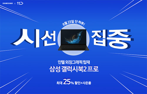 유니씨앤씨는 최신 인텔 12세대 CPU와 인텔 아크 그래픽 탑재, 초슬림 초경량 디자인으로 뛰어난 휴대성을 자랑하는 삼성 갤럭시북2 프로 NT950XEV-G51A 모델을 대상으로 최대 40만원 중복 할인과 푸짐한 사은품이 증정되는 ‘시선집중’ 프로모션을 2022년 8월 23일 단 하루 11번가를 통하여 단독 진행한다.