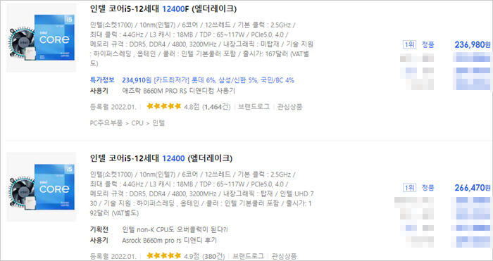 현재 유저들에게 가장 큰 사랑을 받고 있는 12400 시리즈의 가격을 확인하고 있는 모습으로 노멀 프로세서와 약 3만원의 가격차가 발생하는 것을 확인할 수 있다. 내장그래픽을 지원하지 않는 것을 제외하고 대부분의 스펙이 동일해 외장그래픽 사용 유무만 고려해 선택하면 된다.