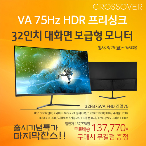 크로스오버는 32형 FHD 75Hz VA 모니터 ‘32FB75VA FHD 리얼75’ 출시 기념 특가전을 진행한다.
