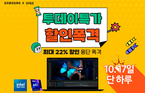 유니씨앤씨는 최신 인텔 12세대 CPU와 인텔 아크 그래픽 탑재, 초슬림 초경량 디자인으로 뛰어난 휴대성을 자랑하는 삼성 갤럭시북2 프로 NT950XEV-G51A 모델을 대상으로 최대 33만원 중복 할인과 푸짐한 사은품이 증정되는 ‘디지털 투데이픽’ 프로모션을 2022년 10월 17일 단 하루 위메프를 통하여 단독 진행한다.