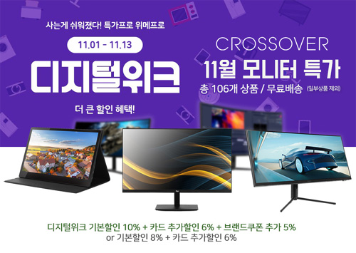 크로스오버는 자사의 인기 게이밍 모니터 106종을 대상으로 위메프 11월 디지털위크 특가전을 실시한다고 밝혔다.
