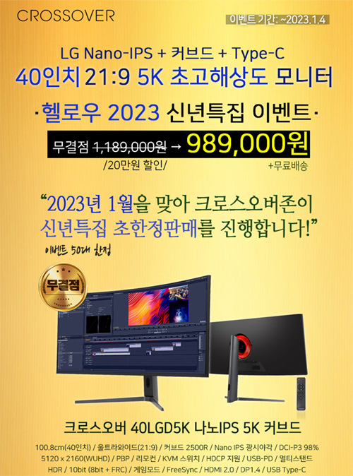 크로스오버가 40형 5K 초고해상도 커브드 모니터 ‘40LGD5K 나노IPS 5K 커브드’를 대상으로 신년특집 초한정판매를 진행한다.