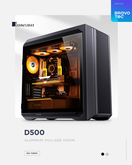 브라보텍에서 알루미늄 합금의 견고하고 고급스러운 디자인에 11개 스토리지와 고성능 컴포넌트를 지원하는 탁월한 확장성의 풀타워 PC 케이스 JONSBO D500 모델을 출시한다.