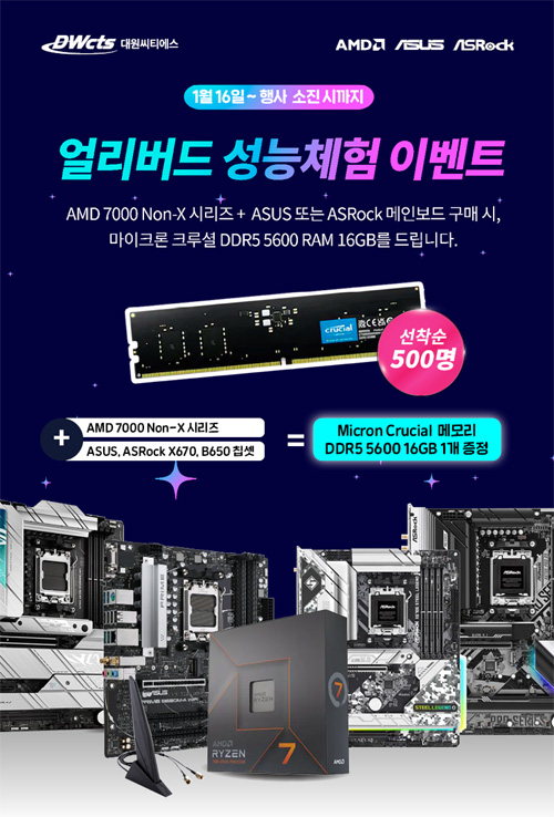 ‘얼리버드 성능 체험’ 이벤트는 대원씨티에스가 유통하는 AMD 라이젠 7000 Non-X 시리즈 CPU와 ASUS 또는 ASRock X670/B650 메인보드를 함께 구입하는 소비자 선착순 500명에게 마이크론 크루셜 DDR5 5,600MHz 16GB 메모리 1개를 증정하는 이벤트다. 이벤트 배너가 적용된 모든 온라인 채널을 통해 참여할 수 있으며 1월 16일부터 진행된다.