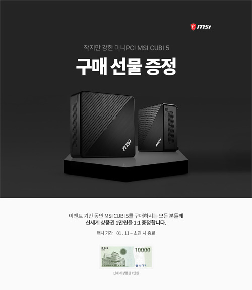 2023년 1월 11일부터 진행되는 이번 이벤트는 출시 이후 꾸준히 사랑받고 있는 미니PC ‘MSI 미니 Cubi 5 C5205U’ 구매고객 대상에게 신세계 상품권 1만원 권을 1:1 증정한다. 이벤트는 경품 소진 시까지 진행될 예정이다.