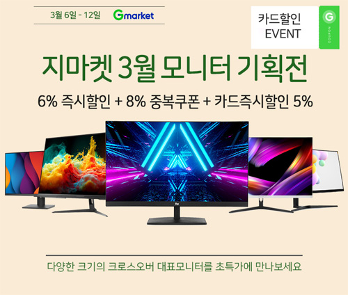 이번 행사 동안 크로스오버의 24형, 27형, 32형, 34형, 40형 등 다양한 모니터들이 저렴하게 판매된다. 행사 기간동안 해당 상품들에 6% 즉시할인, 8% 중복쿠폰을 다운받아 적용한 후 여기에 지마켓 카드즉시할인 5%(최대 7만원)를 더하면 높은 폭의 할인이 가능해진다. 행사기간은 3월 6일 월요일부터 12일 일요일까지 총 일주일간 펼쳐지며 행사기간 동안 판매되는 제품들은 전부 무료배송으로 발송된다. (일부상품 제외)