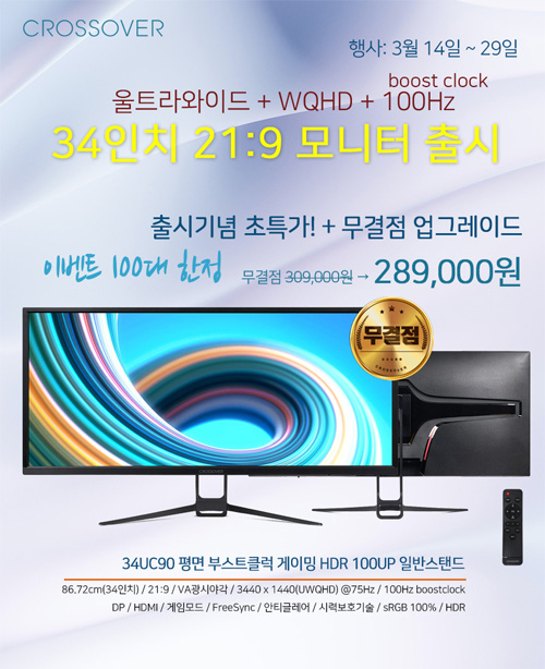 크로스오버가 34형 울트라와이드 모니터 ‘34UC90 평면 부스트클럭 게이밍 HDR 100UP 일반스탠드’ 출시기념 무결점 무료 업그레이드 및 특가 이벤트를 진행한다고 밝혔다.