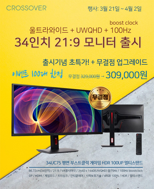 크로스오버, 34UC75 울트라 와이드 패널 모니터 출시 기념 특가 진행