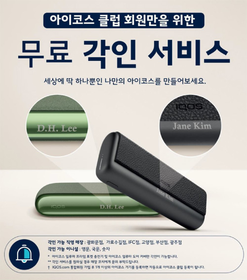 무료 각인 서비스는 여의도IFC점, 광화문점, 가로수길점, 스타필드 고양점, 부산 센텀점, 광주점 등 6개 아이코스 직영 매장에서 제공된다. 영문이나 국문, 숫자를 각인할 수 있으며, 매장에서 아이코스 코치에게 안내를 받아 참여할 수 있다. 아이코스 공식 온라인 스토어인 아이코스 닷컴에서 통합 회원에 가입한 후 1개 이상의 아이코스 기기를 등록하면 아이코스 클럽 회원이 될 수 있다.