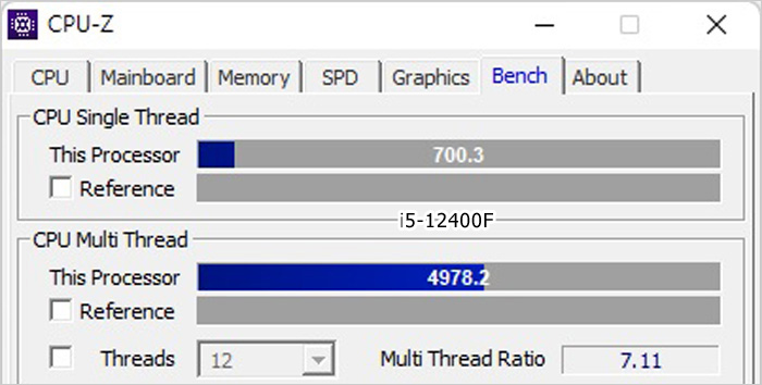 높은 가성비로 아직까지도 높은 판매량을 보여주고 있는 12세대 인텔코어 프로세서 i5-12400F 와의 성능 비교 모습으로 싱글코어 스코어가 약간 상승한데 반해 효율코어 추가와 클럭 향상으로 멀티코어 스코어는 상당히 상승한 것을 확인할 수 있다.