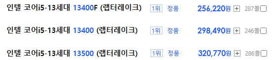 참고로 i5-13400F를 선택하면 기본 쿨러가 제공되어 별도로 쿨러를 구입할 필요가 없다. 또한 B나 H 메인보드 사용이 가능하기 때문에 Z메인보드 구입으로 인한 과도한 비용지출을 막을 수 있다. 또한 PBP도 낮아 파워 서플라이도 600~700W 선에서 선택할 수 있으며 DDR4 메인보드도 판매되고 있어 기존에 사용하던 메모리를 재활용해 비용을 절약할 수 있다.