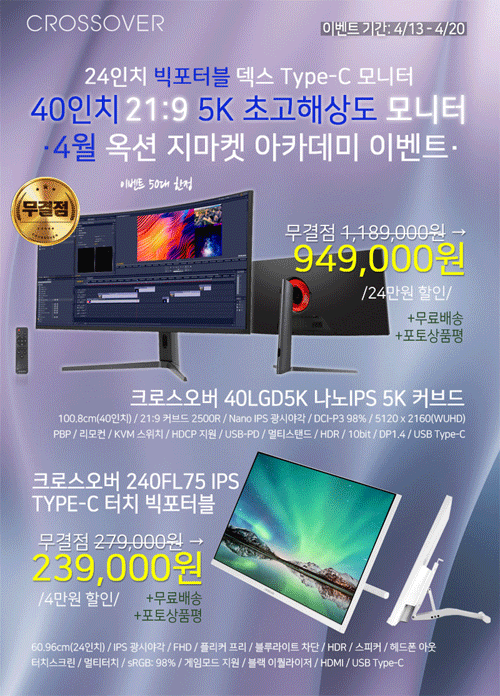 크로스오버가 40형 5K 초고해상도 커브드 모니터 ‘40LGD5K 나노IPS 5K 커브드’와 24형 덱스지원 ‘240FL75 IPS TYPE-C 터치 빅포터블’을 대상으로 옥션 지마켓 4월 아카데미 특가전을 진행한다.