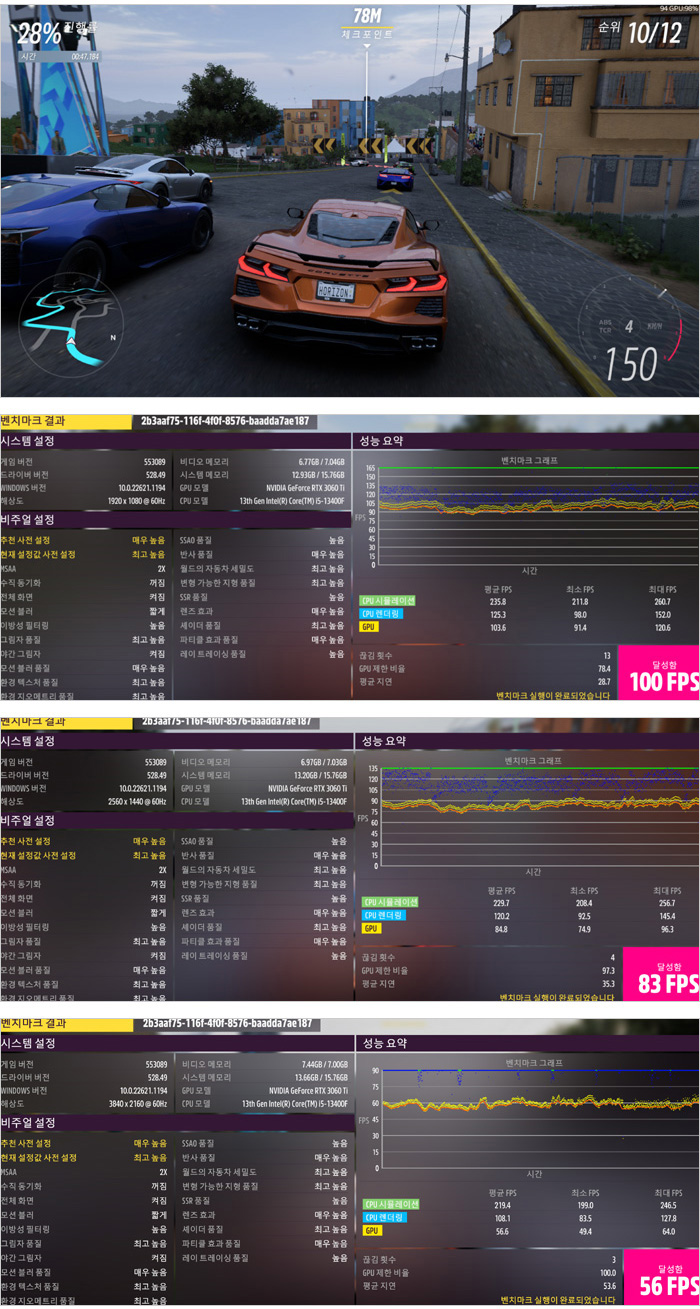 화려한 그래픽이 매력적인 포르자 호라이즌 5 벤치마크를 실행한 모습으로 QHD 해상도에서 80FPS 이상을 보여주는 것을 확인할 수 있었다. (옵션 : 최고 높음) 성능걱정 없이 게임을 즐길 수 있을 것이다.