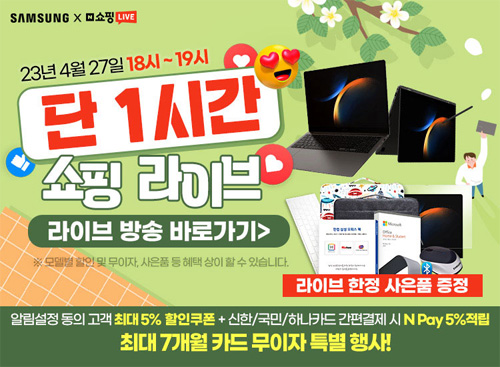 엔씨디지텍에서 4월 27일 오후 6시부터 7시까지 1시간 동안 네이버 쇼핑라이브를 통해 갤럭시북3 인기모델 3종을 대상으로 ‘블루밍데이즈 특집 갤럭시북3 특별전’ 라이브 방송을 진행한다고 한다.