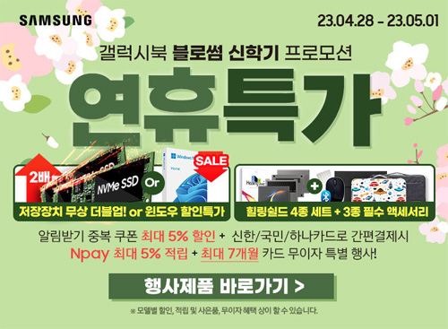 엔씨디지텍은 5월 1일까지 네이버 스토어를 통해 신규 런칭 직후 완판 행진을 기록한 2023 갤럭시북3 모델을 대상으로 ‘갤럭시북 블로썸 주말 한정 특가 행사’를 진행한다고 한다.