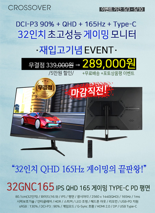 크로스오버가 32형 QHD 165Hz를 지원하는 프로급 게이밍 모니터 ‘32GNC165 IPS QHD 165 게이밍 TYPE-C PD 평면’ 재입고 기념 특가전을 진행한다.