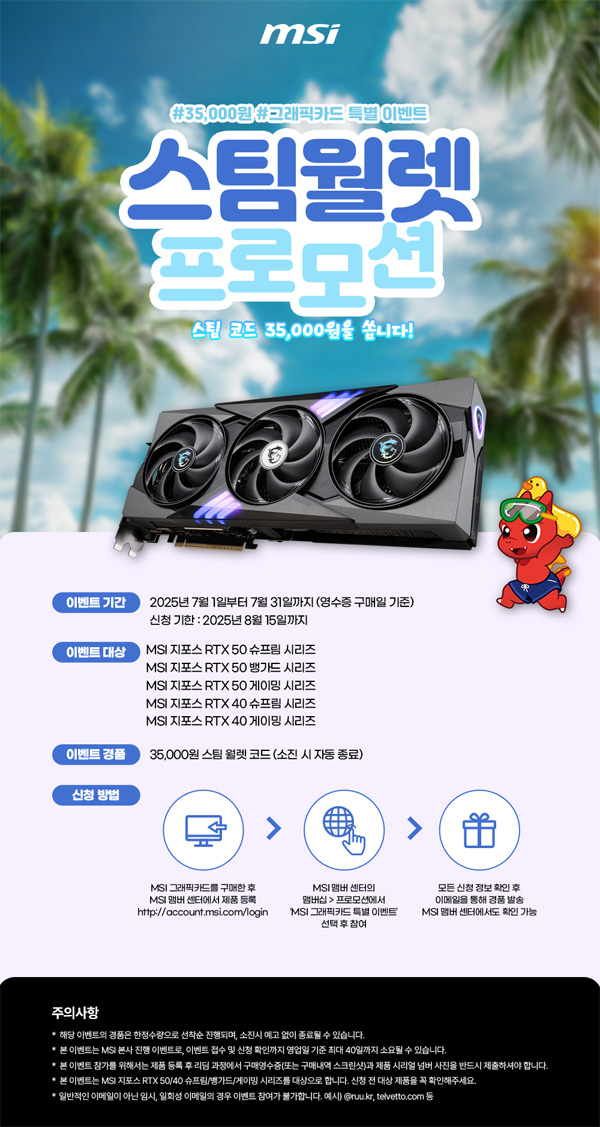 MSI 스팀 월렛 프로모션은 MSI 지포스 그래픽카드 구매 고객에게 감사의 마음을 전하고, MSI의 강력한 그래픽카드 성능과 최고의 게이밍 플랫폼 스팀(STEAM)에서 최고의 게이밍 라이프를 즐길 수 있도록 지원하기 위해 기획되었다. 프로모션 신청 기한은 2025년 8월 15일까지이며, 신청이 완료되면 담당자의 확인을 거쳐 스팀 월렛 코드가 이메일로 발송된다. 증정되는 코드를 스팀 계정에 등록하면 즉시 35,000원을 충전하여 최신 게임 구매 등에 자유롭게 사용할 수 있다.