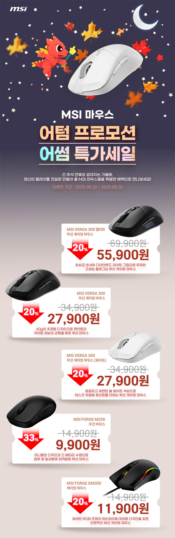 행사 대상 주요 모델은 초경량 디자인과 정밀한 센서로 최고의 게이밍 퍼포먼스를 제공하는 ‘MSI VERSA 300 엘리트 무선 게이밍 마우스’와 인체공학적 설계로 장시간 사용에도 편안한 그립감을 선사하는 ‘MSI VERSA 300 무선 게이밍 마우스(블랙/화이트)’,그리고 사무용에 특화된 ‘MSI FORGE M200 무선 마우스’와 유선 제품인 ‘MSI FORGE GM300 게이밍 마우스’등 총 5종이다.이번 특가 이벤트를 통해 정상가 대비 최대 33%까지 구매할 수 있으며, 준비된 수량 소진 시 행사는 조기 마감될 수 있다.