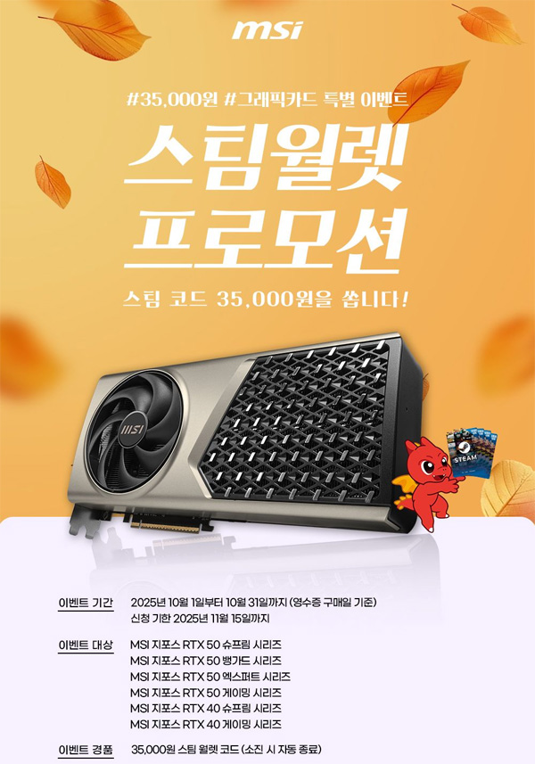 MSI는 지포스 그래픽카드 10월 구매 고객을 대상으로 35,000원 스팀 월렛 코드를 증정하는 프로모션을 진행한다고 밝혔다.