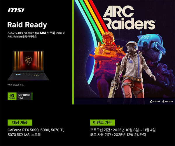 MSI는 엔비디아 블랙웰(Blackwell) 아키텍처 기반 지포스 RTX 50 시리즈 랩톱 GPU를 탑재한 MSI 노트북 구매 고객을 대상으로 PvPvE 서바이벌 액션 게임 아크레이더스(ARC Raiders) 스탠다드 에디션과방랑자?아스트로코스메틱 팩을 무료로 제공하는 번들 프로모션을 진행한다고 밝혔다.