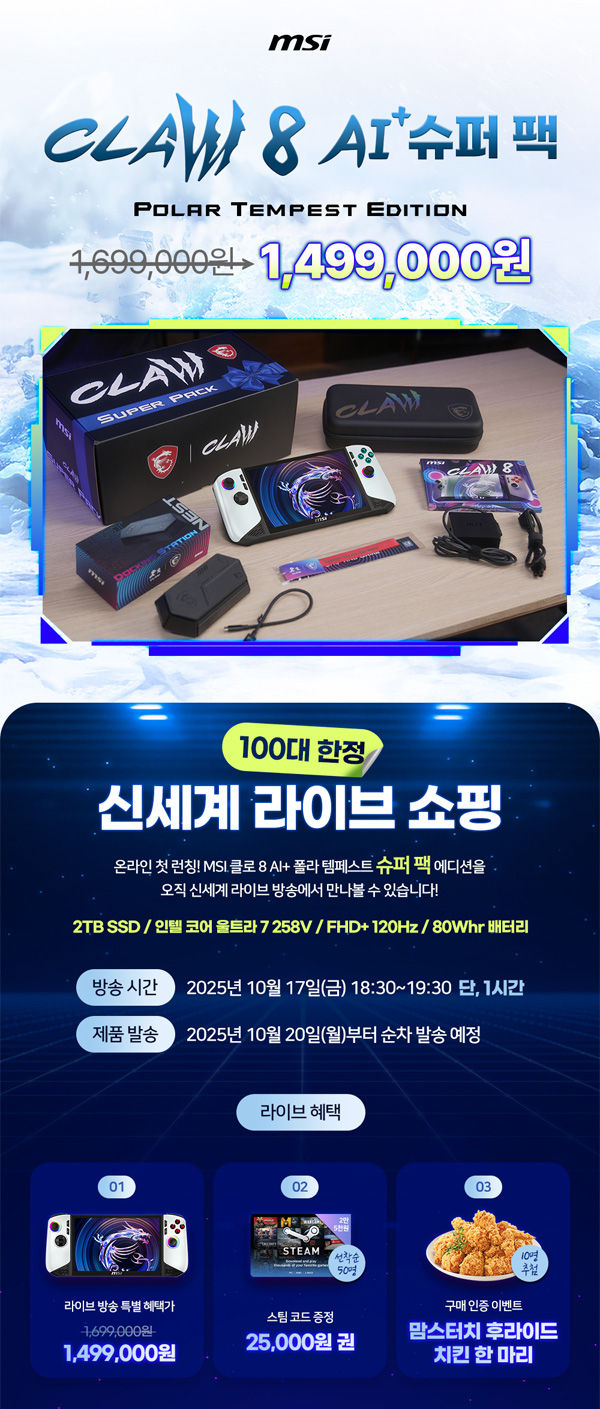 MSI는 오는 10월 17일(금) 오후 6시 30분부터 7시 30분까지 신세계쇼핑 모바일 라이브 방송( https://sflex.us/VY1cMx1)을 통해, 게이밍 핸드헬드 클로 8 AI+ A2VM-U7 폴라템페스트 에디션 WIN11 슈퍼 팩을 단 100대 한정으로 파격 특가에 판매한다.
