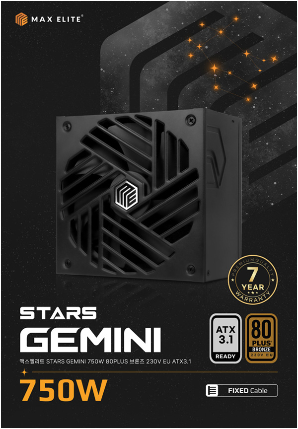 STARSGEMINI 시리즈는 맥스엘리트에서 이전에 선보였던 STARS CYGNUS 시리즈와 동일하게 맥스엘리트 파워서플라이 전문 기술력을 담아, 145mm 깊이의 파워에 빈틈 없는 140mm FDB 팬 장착으로 많은 풍량에 의한 강력한 쿨링 성능과 함께 낮은 팬 회전 속도 (RPM)으로 정숙한 작동이 돋보이는 제품이다. 80PLUS BRONZE 등급의 고효율과 최신 ATX 3.1 규격을 완벽 지원한다.