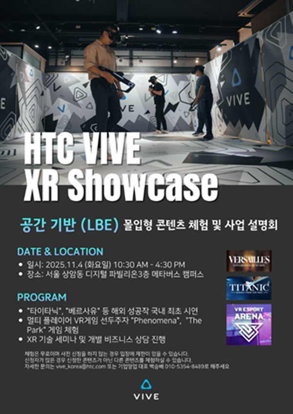 이번 행사는 HTC VIVE의 위치 기반 엔터테인먼트(LBE) 기술을 통해 대형 공간에서 참가자가 자유롭게 이동하며 체험할 수 있는 몰입형 콘텐츠를 선보인다. 특히, 전 세계적으로 흥행한 '타이타닉', '베르사유 ' 등 해외 성공작을 국내 최초로 시연할 예정이다.