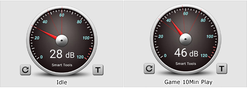 팬소음 테스트를 진행하고 있는 모습으로 (최고성능 모드) 아이들 상태에서는 팬소리가 들리지 않았으며 게임을 실행하면 팬이 최대 속도로 동작해 팬소음이 커지는 것을 확인할 수 있었다. @ 참고로 테스트 소음은 팬소음을 포함한 사무실 전체의 생활소음이다. 이점 참조 바란다.