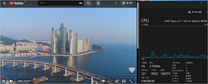 유튜브 고화질 동영상을 이용해 CPU 점유율을 테스트 하고 있는 모습으로 (2160P@60FPS) 3-10% 대의 점유율을 보여 주었으며 인터넷을 실행했을 때 20% 초반까지 점유율이 올라가는 것을 확인할 수 있었다.