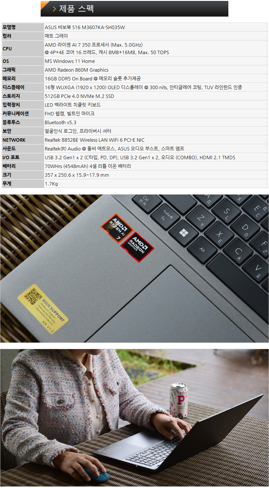 이번에 리뷰를 진행 할 ASUS 비보북 S16 M3607KA-SH035W 는 100만원 초반대에 구입할 수 있는 고급형 AI 노트북으로 최대 50TOPS 로 AI 퍼포먼스를 높인 AMD 라이젠 AI 7 350 프로세서를 탑재하고 16GB 메모리를 지원해 문서작업이나 웹서핑은 물론 다양한 AI 기술을 편하게 실행할 수 있다. 또한 512GB PCIe 4.0 NVMe SSD가 장착되어 여유롭게 대용량 파일을 저장할 수 있으며 긴 배터리 사용시간 지원으로 잦은 휴대가 필수적인 유저들이 전원 걱정없이 사용할 수 있다.