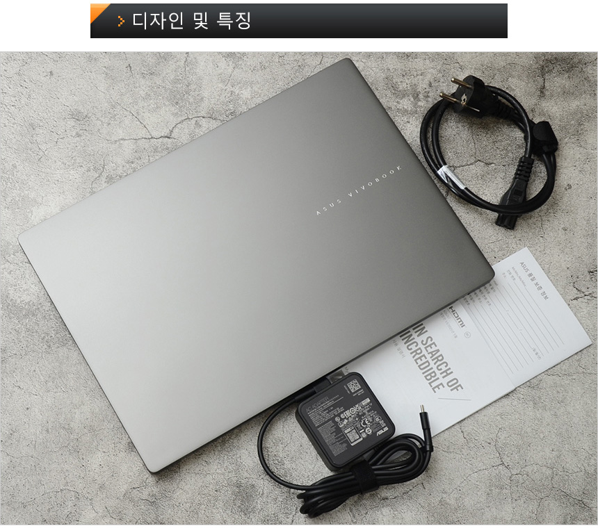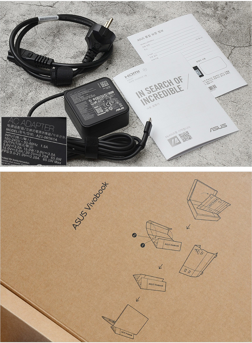 풀KIT 의 모습으로 노트북을 비롯해 C타입 65W 전원 어댑터와 전원 케이블을 비롯해 보증서, 퀵 매뉴얼이 포함된 것을 확인할 수 있다.